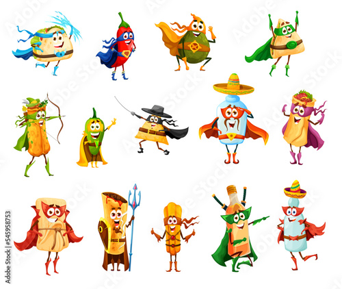 Tex mex mexican food superhero and defender characters. Isolated vector tacos, burrito, chili pepper and nachos, enchiladas, jalapeno, tamale and chimichanga with tequila, churros, mezcal and pulque