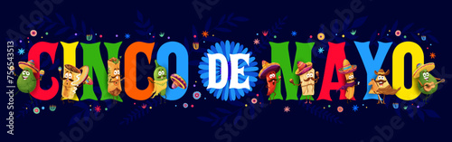 Cartoon Tex Mex food mexican characters on Cinco de Mayo holiday banner. Latin holiday celebration flyer, Cinco de Mayo poster or vector background with burrito, nacho and avocado, jalapeno, churro