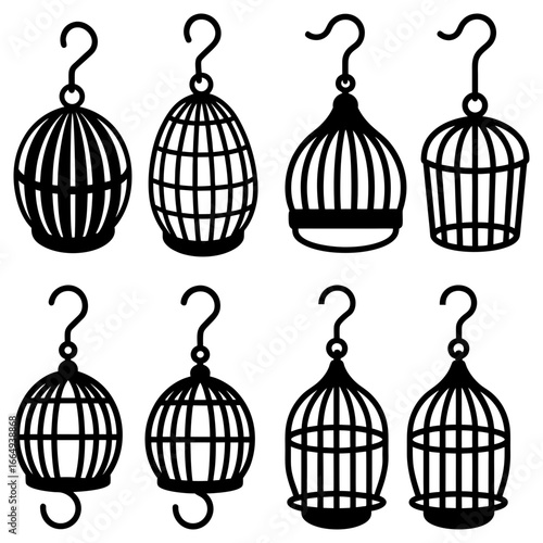 Birds cages silhouettes. Domestic birds sitting in metal cages silhouette, cockatoo, finch, canary and budgie flat vector illustration set. Black ink cages collection