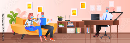 Online counseling concept, couple discussing mental problems with family psychologist. Couple misunderstanding. Cartoon characters flat style isolated illustration. Vector psychotherapy help