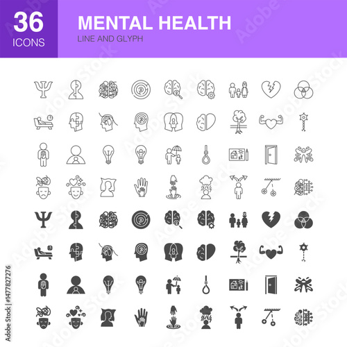 Psychology and mental icons set. Containing depression, anxiety, stress, mental care, empathy, loneliness, bipolar, PTSD, psychology symbol, panic, mind disorder and more. Vector illustration
