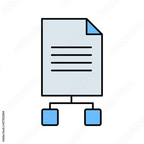 File system hierarchy,  Folders and files. Flowchart connecting documents to a central system ending with verified documents. Document management, digital workflows, data organization. Flat Cartoon