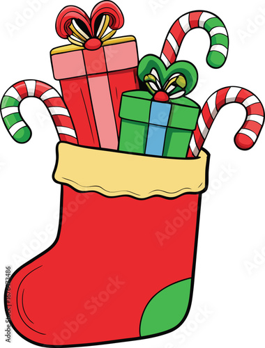 Festive merry christmas greeting with rows of colorful holiday stockings and gift boxes on a light green background