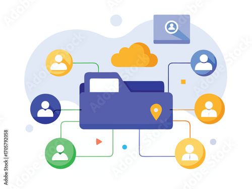 Businessman working on digital folder and files sharing transfered via cloud computing. Wireless technology on mobile and tablet devices for smart working. 3D vector.