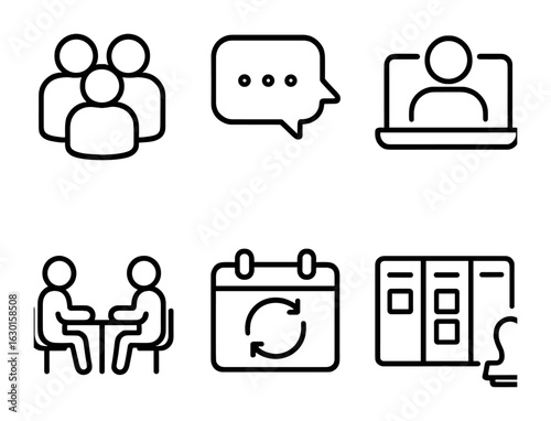 Digital Study Collaboration Doodles. Group study: hand drawn doodles of chat bubble, shared screen, emoji reaction, file exchange,