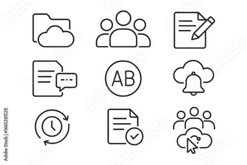 Flat vector icons of file sharing and collaboration: file transfer arrow, shared doc icon, version history clock, real-time editing hand, sync cloud symbol, approval check, collaborative folder,
