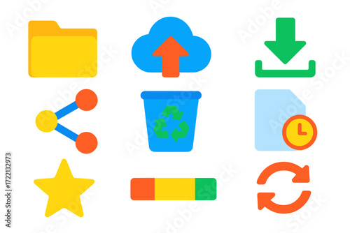 Flat vector icons of mobile cloud storage apps in circular style: upload icon, cloud folder, file sync, access permission, shared document, recent files, deleted files, storage meter.