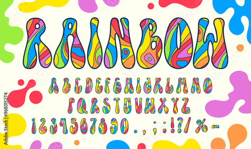 Retro 60s hippie typeface and psychedelic rainbow font of 70s groovy type, vector bold wavy alphabet. Psychedelic rainbow font letters in retro hippie art for cartoon type and funky trippy typeface