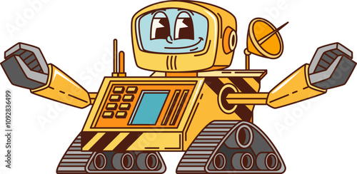 Cartoon retro groovy robot character or robotic cyborg, vector comic art. Groovy funky retro robot with happy smile on face display, mechanic humanoid with gripper hands for cartoon freaky alien