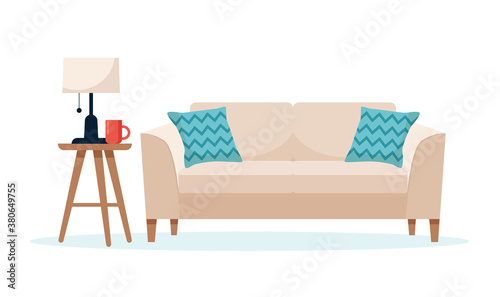 Modern sofa with a side table, cute interior vector illustration in flat style
