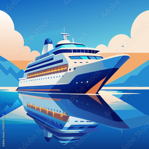 Coastal cityscape with tall modern buildings, harbor with docked ships, and promenade along the shore, vector illustration art