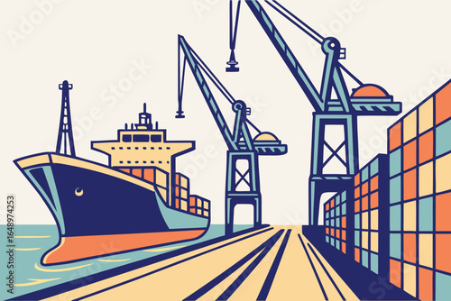 Transport cargo sea ship loading containers by harbor crane in shipping port vector illustration