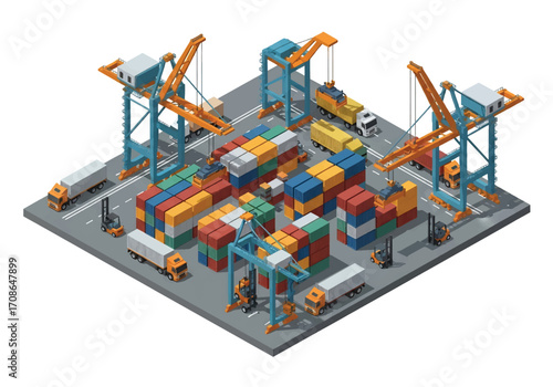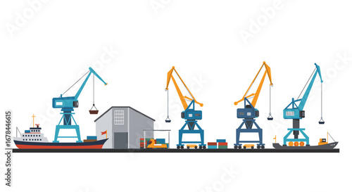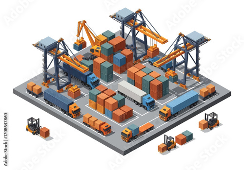 Isometric cargo logistics ships, cranes, containers, and maritime operations