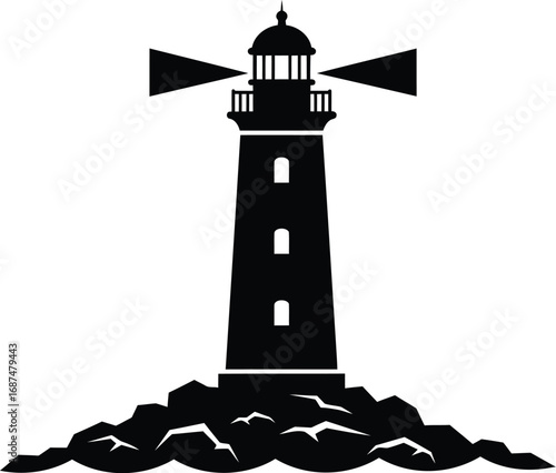 Lighthouse Searchlight Beacon Tower Island Beach Coast Silhouette with sunset or sunrise logo