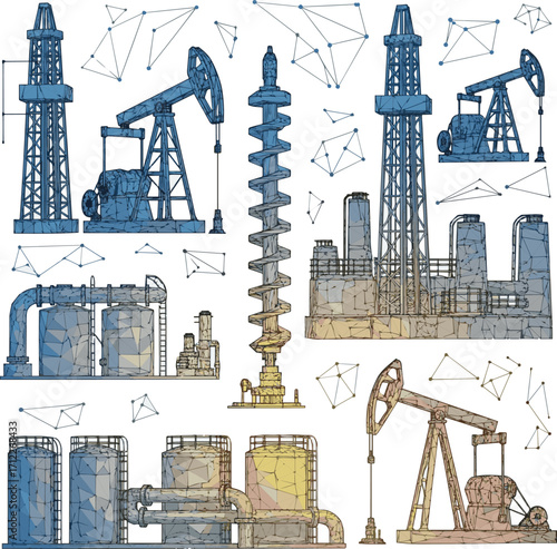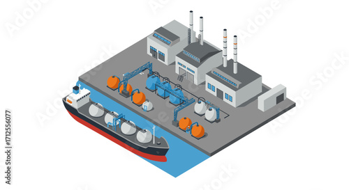 Coastal marine port with fishing boats and industrial buildings in isometric view
