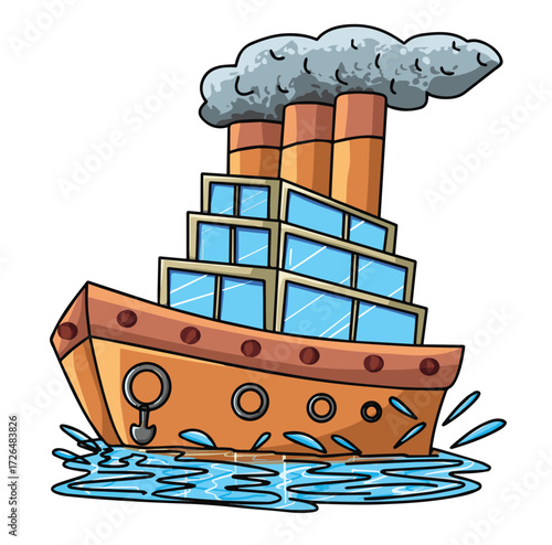 Adorable cartoon fishing boat sails with joy on the undulating ocean waves artwork