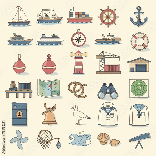 Coastal Icon Set. Flat vector icons of coastal scenery: sandy beach, rocky cliff, harbor dock, marina, seaside village, pier,