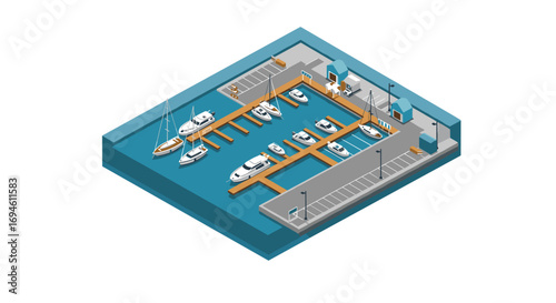 Three-dimensional isometric view showcasing marina pier sailboat and yacht harbor vector illustration isolated on white background