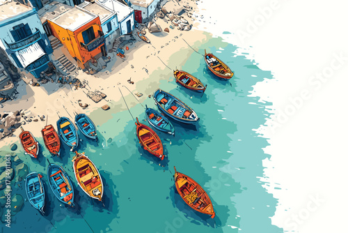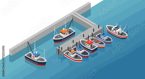 Fishing boats docked at a harbor in isometric style with clear blue water and pier