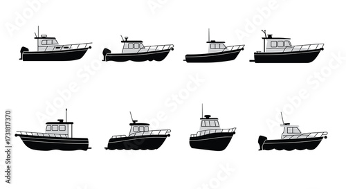 Set of various boat and ship silhouettes including sailboat, fishing boat, tugboat, yacht, canoe, and catamaran vector
