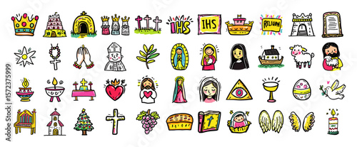 Christian Religion doodle icon set. Christianity Vector illustration collection. Cross and symbols Hand drawn Line art style. Easter concept