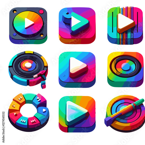 Icon set featuring various media player designs and user interfaces for digital entertainment applications