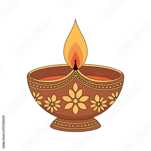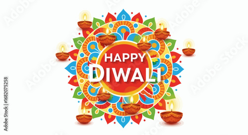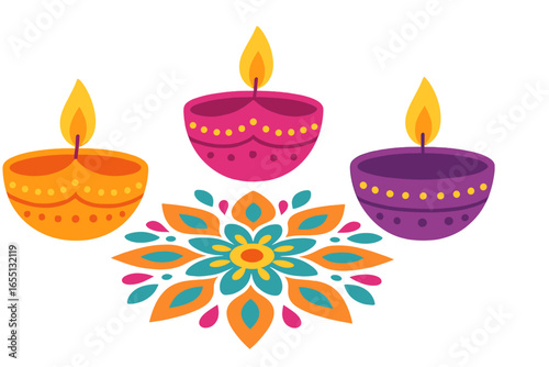 Traditional Indian Diwali festival celebration elements set with diya lamps, sweets, gifts, and decorations