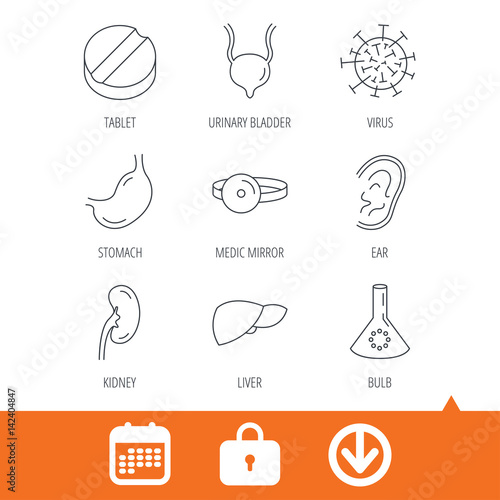 Set line Bedpan, Monitor with cardiogram, IV bag, Medical otoscope tool, thermometer, First aid kit, Blood pressure and tweezers icon. Vector