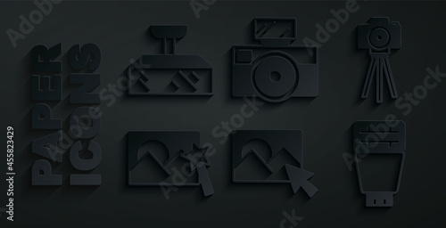 Set paper cut Photo retouching, camera, and Empty photo studio icon. Paper art style. Vector