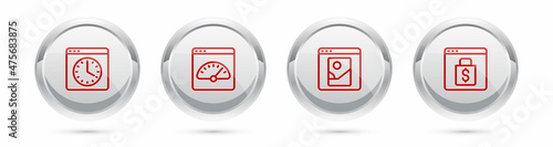 Set line Music or video editing, Photo retouching, Speaker volume and . Silver circle button. Vector