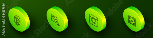Set Isometric line Photo retouching, frame, camera flash and Camera focus line icon. Vector