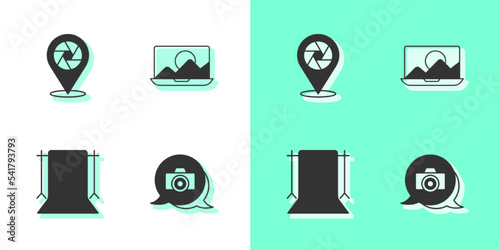 Set Photo camera, Camera shutter, Empty photo studio and retouching icon. Vector