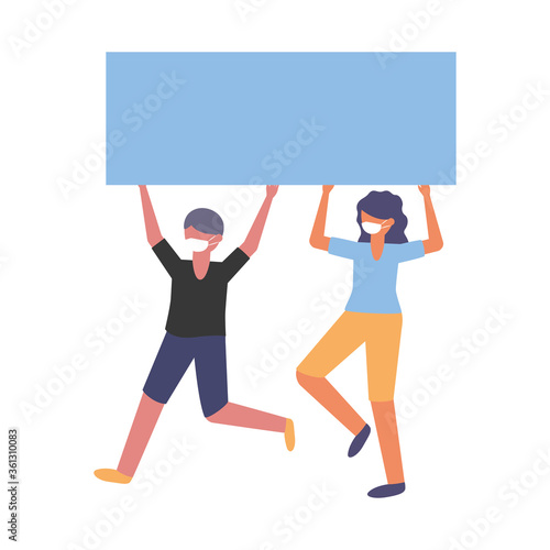 Set of Protesters crowd man and woman in medical masks from virus COVID, holding empty banners. Activists protesting, during a pandemic quarantine coronavirus, political meeting, strike human rights