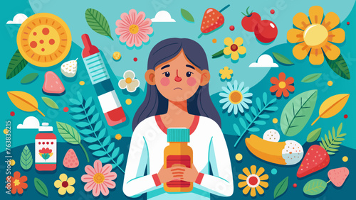 vivid illustration of woman with allergies to pollen, citrus fruits, berries. sad facial expression, redness, skin rash, poor health, nasal congestion, runny nose. Seasonal disease. allergy pills