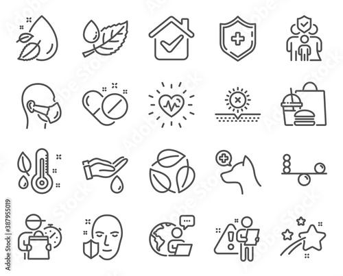 Healthcare icons set. Included icon as Leaf dew, Water drop, Leaves signs. Medical shield, Medical pills, Balance symbols. Veterinary clinic, Wash hands, Family insurance. No sun. Vector