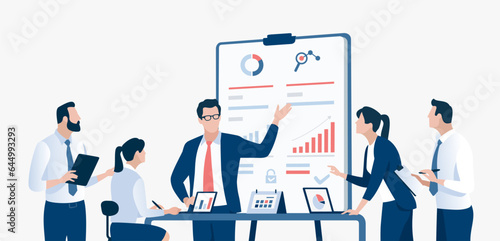 Strategy. Meeting. A leader explains business strategy standing on front of a flipchart. The team is working on a project. Vector illustration