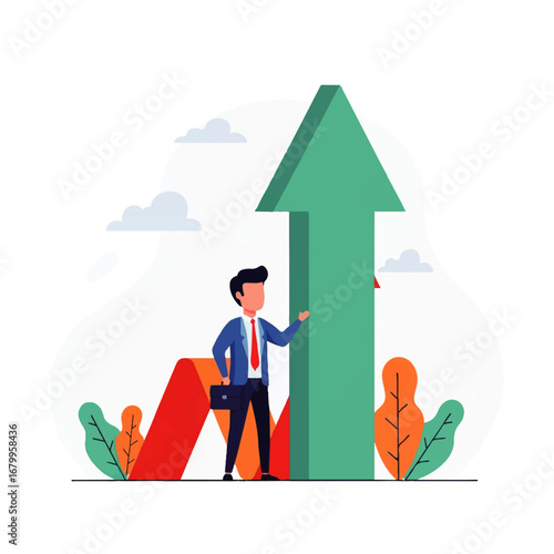 A man in a suit stands next to a large chart showing an upward trend with a plant in the corner room