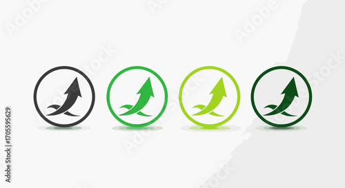 Four business growth graph icon variations with an upward trend arrow, illustrating financial success in sketch, line art, inverse, and colorful flat vector styles