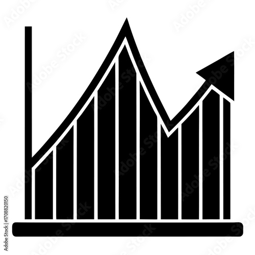 Black single arrow growing up chart graph bars filled icon, success graph trending upwards flat design interface infographic element for app ui ux web button, vector isolated on white background