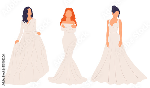Collection of characters of the bride and groom of different races in wedding dresses. flat design style vector illustration.
