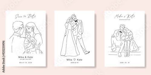 Elegant wedding invitation card background vector. Minimal hand drawn bride and groom in black line art. Design for wedding, vip cover template, rsvp modern card, poster.