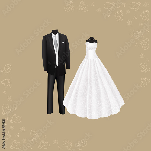 Bride and groom in wedding dress, couple in love in classic elegant outfits, party invitation. Isolated Vector illustration in flat style.