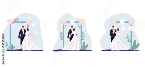 Set of Wedding Couple, couple in love characters cartoon for love valentine's day, holidays, celebrating marriage, romance, hearts, date, sweet, wedding flower, Just married , newlyweds, bride, groom.