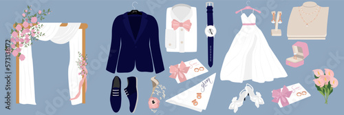 Hand Drawn Wedding Outfit. Watercolor Set of Wedding Elements. Wedding Invitation Design.