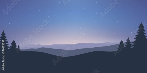 Winter night landscape with snowy mountains, pine forest, full moon and stars in the sky. Serene nature scenery. Modern flat vector cartoon illustration for background.