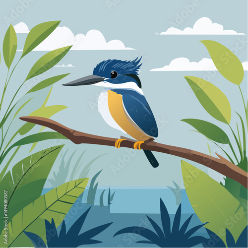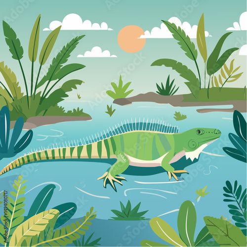 A flock of pink Roseate spoonbill birds in the water. Pond with white water lilies and grass. Animals of Florida, Chile and Argentina. Everglades national park. Rainforest. Realistic Vector Landscape