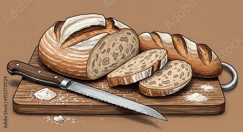 Loaf of sourdough bread with a crusty exterior, placed on a cutting board, vector illustration art