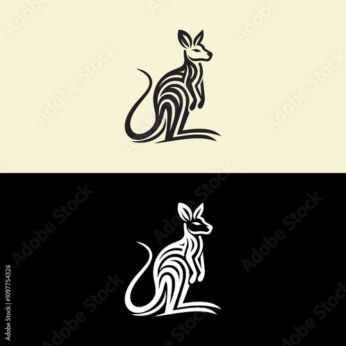 A modern illustration of a kangaroo's black silhouette is isolated on a white background, showcasing a jumping kangaroo