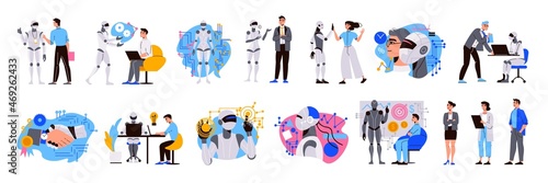 Robotic arm executing tasks, woman working on a laptop, ID card with photo and details. Ideal for automation, workplace, identity, tech innovation, management, productivity simple flat metaphor