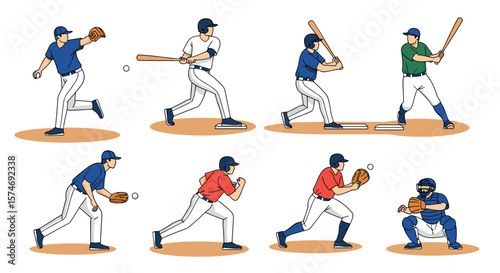 Illustrations of baseball players executing various game actions including pitching batting fielding and catching